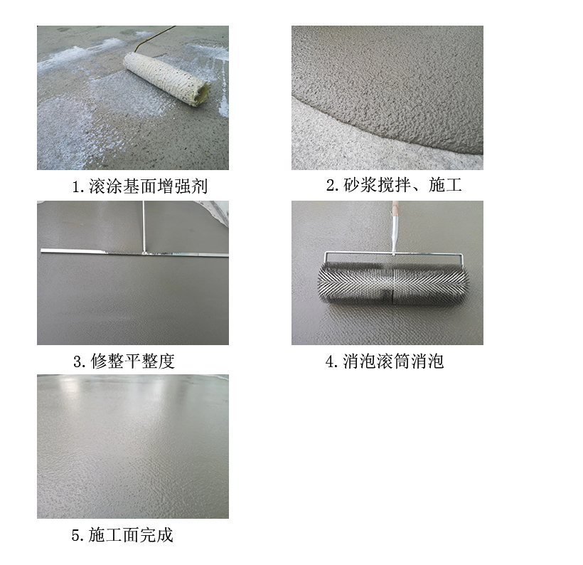 搅拌好的材料铺涂基面,用靠尺依靠前期阴角的打点,对流平砂浆进行一个流动修正,利用流平消泡滚筒来回滚动,减少流平砂浆气泡,提高流平砂浆密室度及提高流平砂浆平整度。